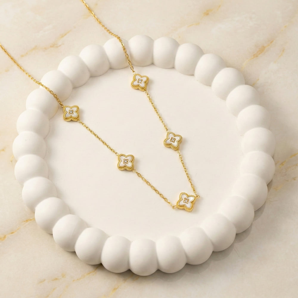 This elegant necklace features a delicate gold-tone chain adorned with four-petal floral motifs, highlighted with a soft white enamel finish and subtle crystal detailing at the center. The clean floral shapes paired with gentle contrast create a refined, graceful look that feels modern yet timeless. The evenly spaced design adds visual balance while keeping the necklace light and elegant.