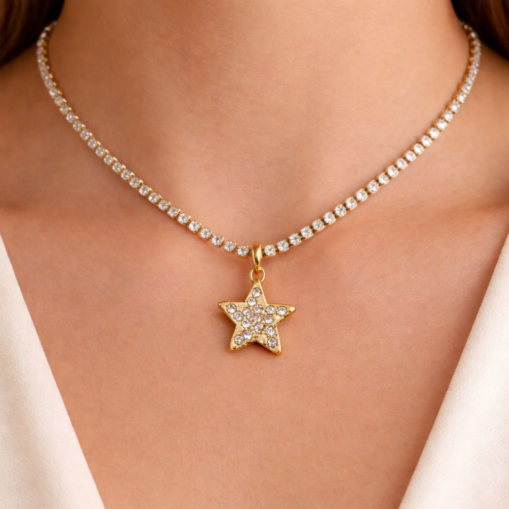 The star pendant design symbolizes beauty, hope, and brilliance. Its carefully arranged crystal stones capture light from every angle, creating a sparkling centerpiece that instantly elevates your look. The refined gold finish enhances the brilliance of the crystals, giving the necklace a luxurious and sophisticated appearance.
