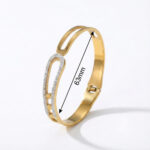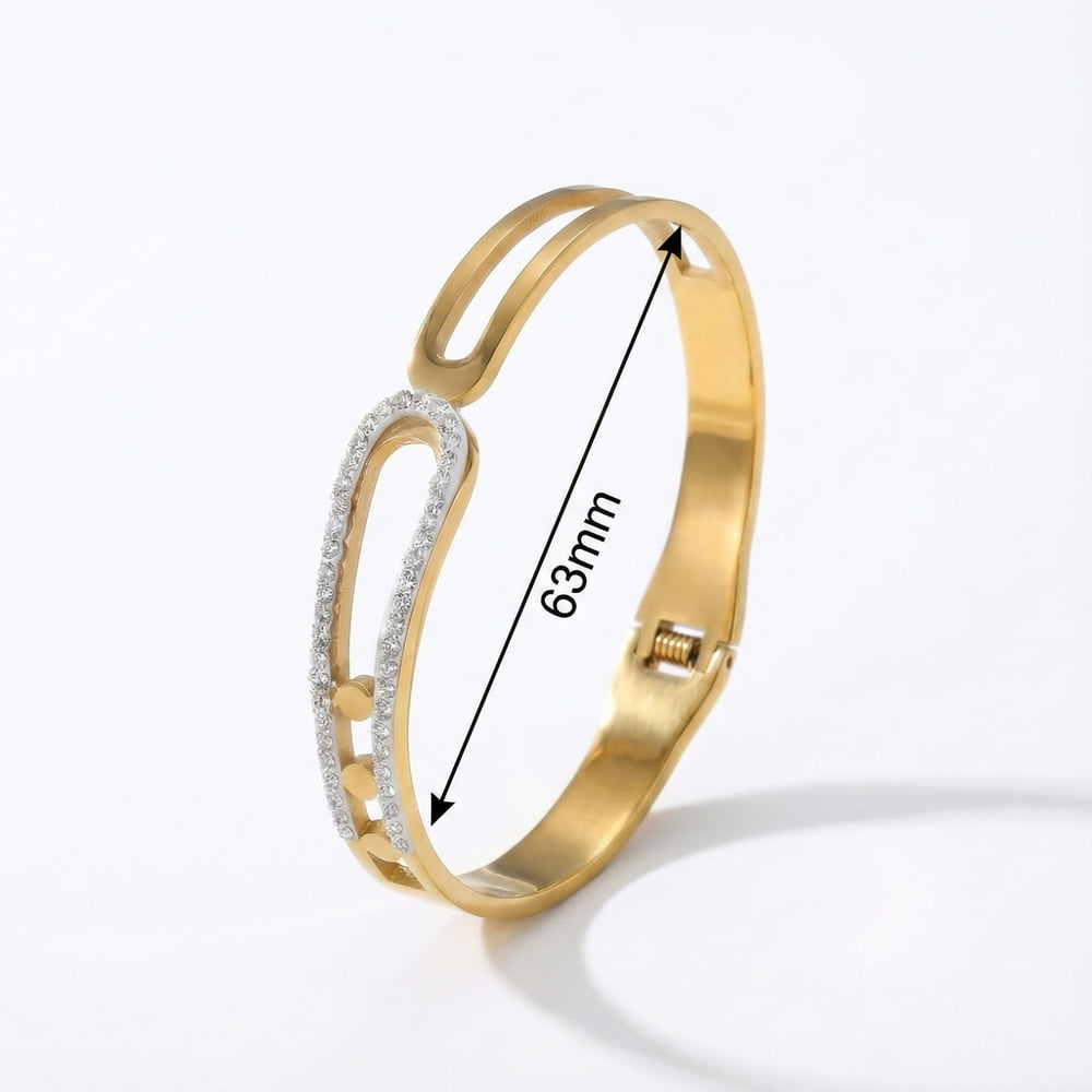 This elegant open bangle features a sleek gold-tone structure accented with a crystal-lined edge that adds refined sparkle. The modern open-frame design gives it a lightweight, contemporary feel, while the clean curves and polished finish create a sophisticated silhouette. The crystal detailing subtly enhances the design without overpowering its minimalist elegance.