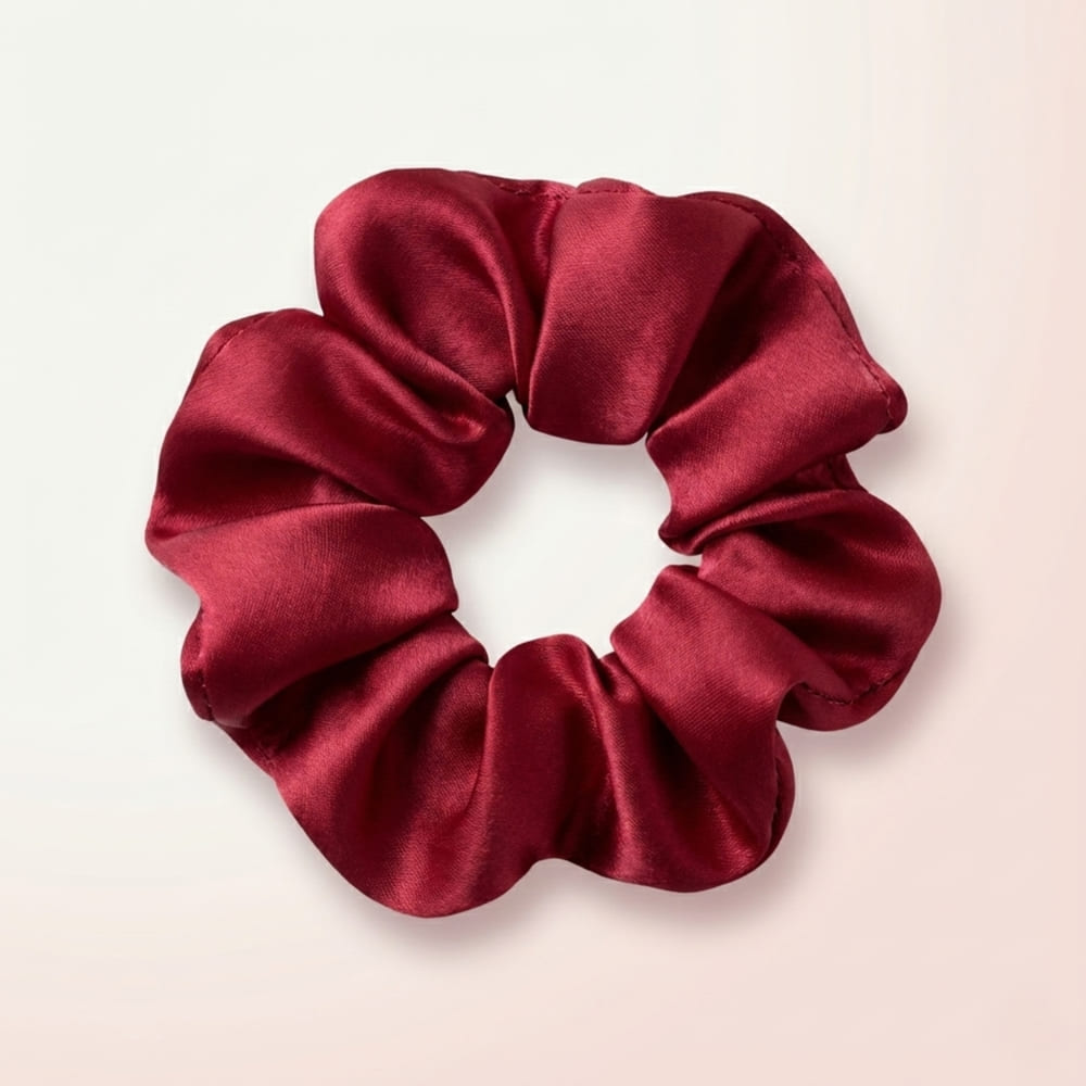 A rich maroon satin scrunchie designed to add a touch of elegance to your everyday hairstyles. Crafted with smooth, soft fabric for a comfortable, hair-friendly hold.