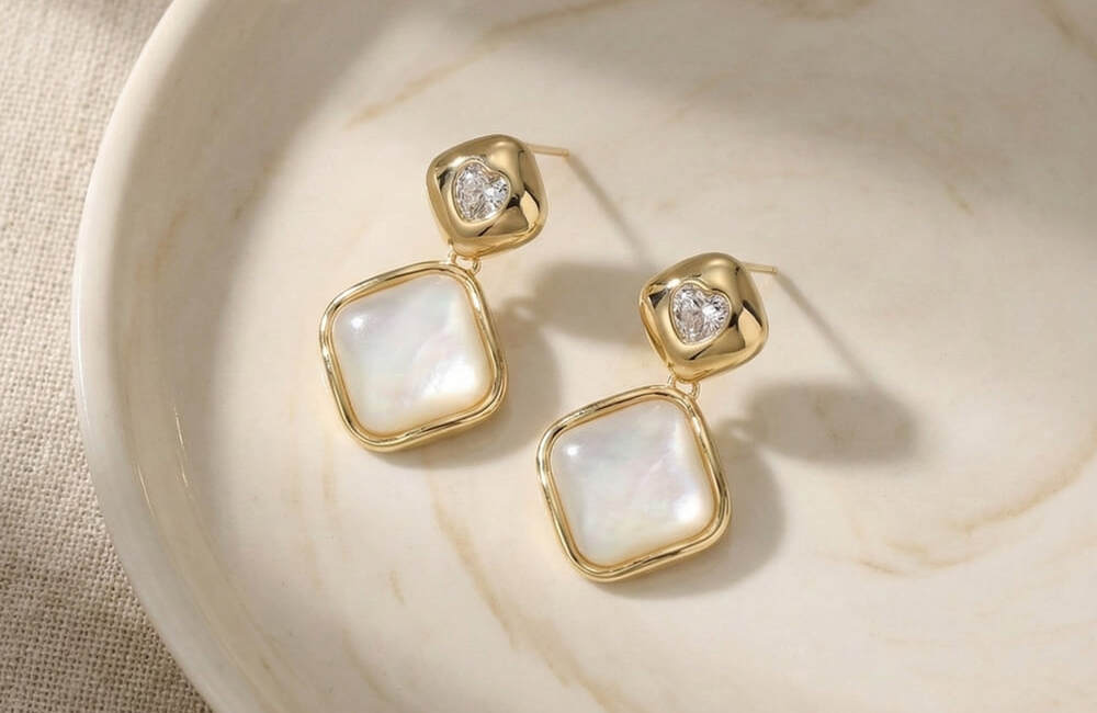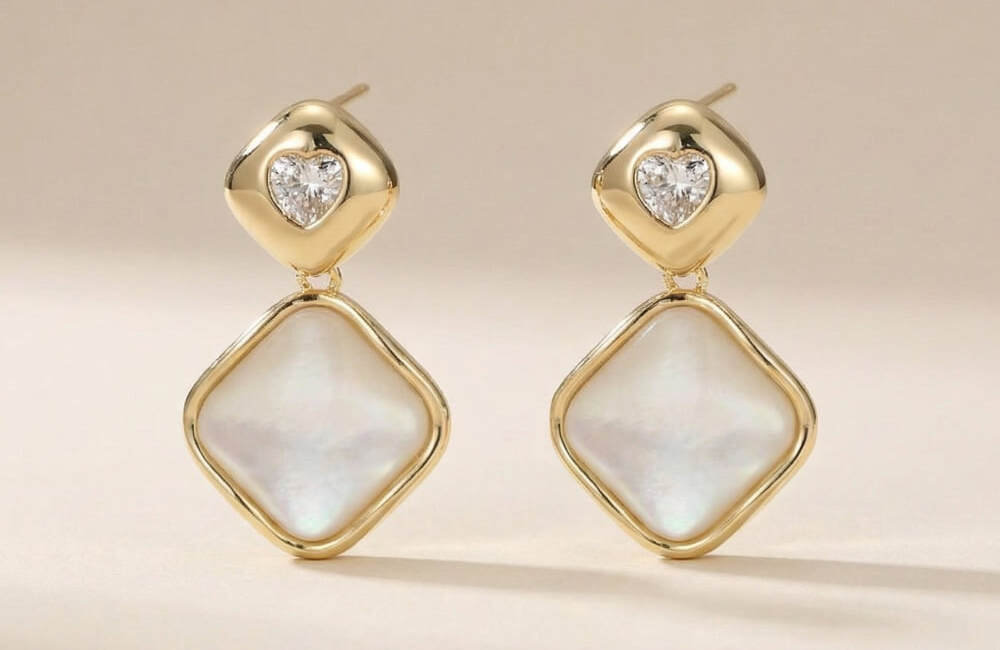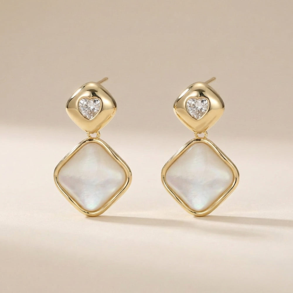 These elegant drop earrings feature a refined combination of soft white stone panels framed in a smooth gold-tone border, paired with a delicate crystal accent at the top. The geometric drop shape adds modern sophistication, while the subtle iridescence of the white stone brings a graceful glow. Clean lines and balanced proportions make the design look timeless and premium.