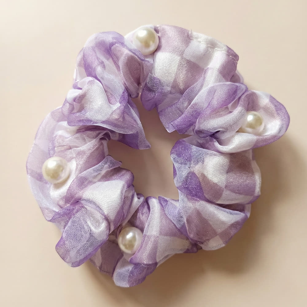 This lavender and white check scrunchie showcases a soft pastel palette paired with a lightweight, semi-sheer fabric that feels delicate and elegant. The gentle check pattern adds a subtle visual texture, while the pearl accents introduce a refined, graceful charm. Its calm lavender tone creates a soothing, feminine look that enhances hairstyles with effortless elegance.