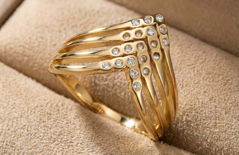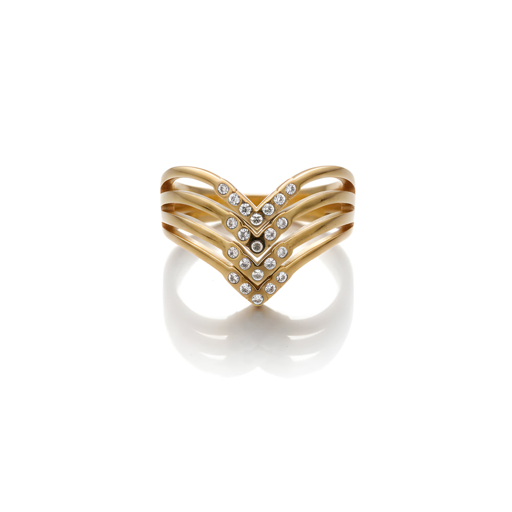 A sophisticated layered chevron finger ring highlighted with delicate crystal detailing and finished in Anti Tarnish gold. A modern statement piece that blends elegance with bold design.