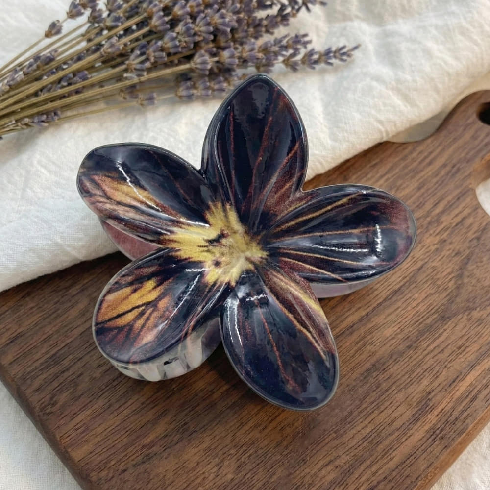 Make a bold style statement with this large midnight flower hair clip, featuring rich dark tones with golden highlights and a smooth glossy finish. Designed to stand out, it adds effortless elegance to both casual and dressy hairstyles.