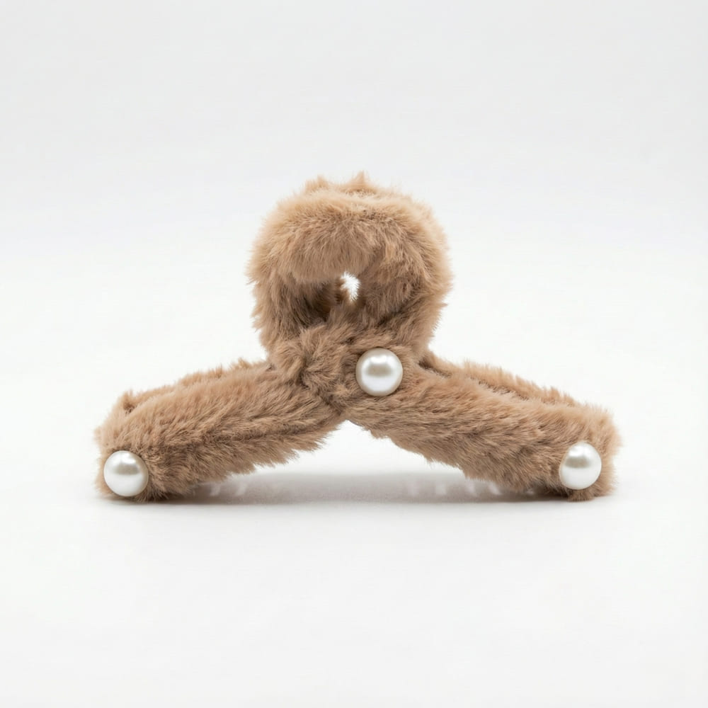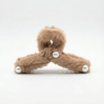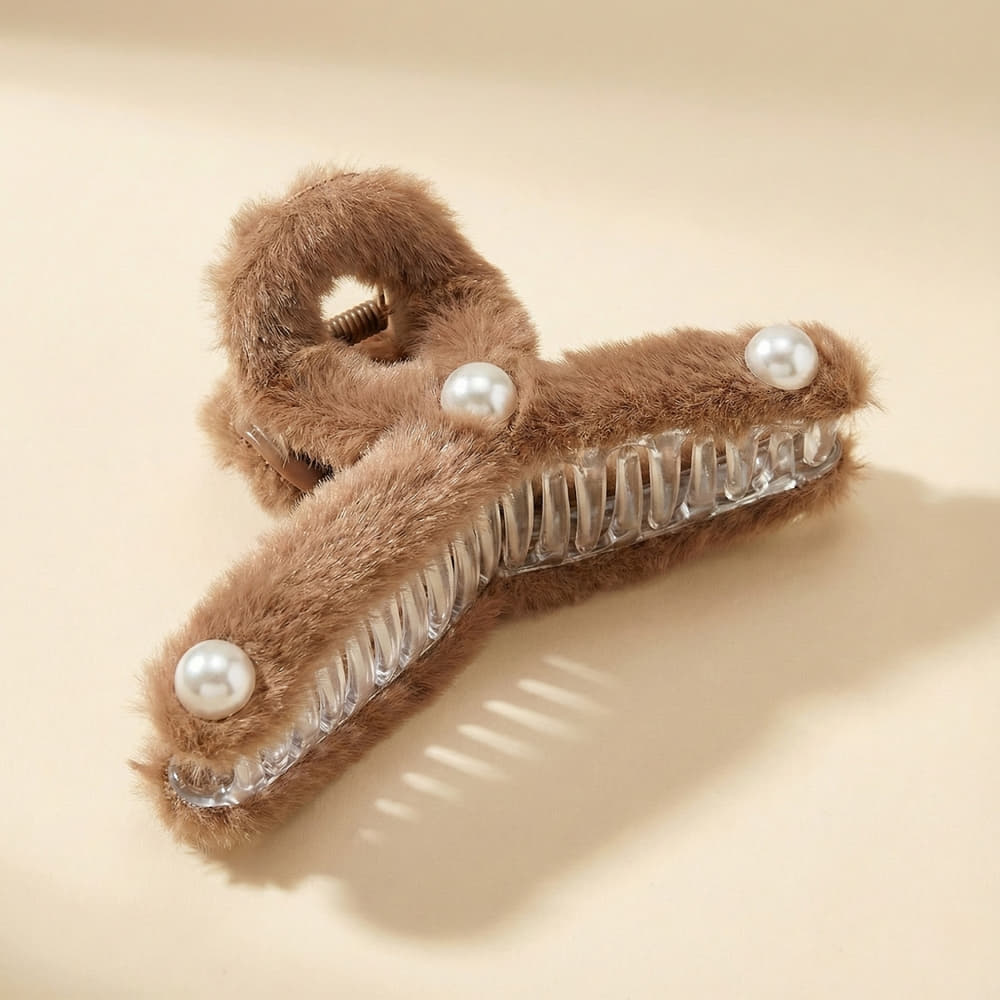 This soft brown fur hair claw features delicate pearl accents for a refined look. Lightweight yet sturdy, it holds hair comfortably in place while adding a cozy, stylish touch to any hairstyle.